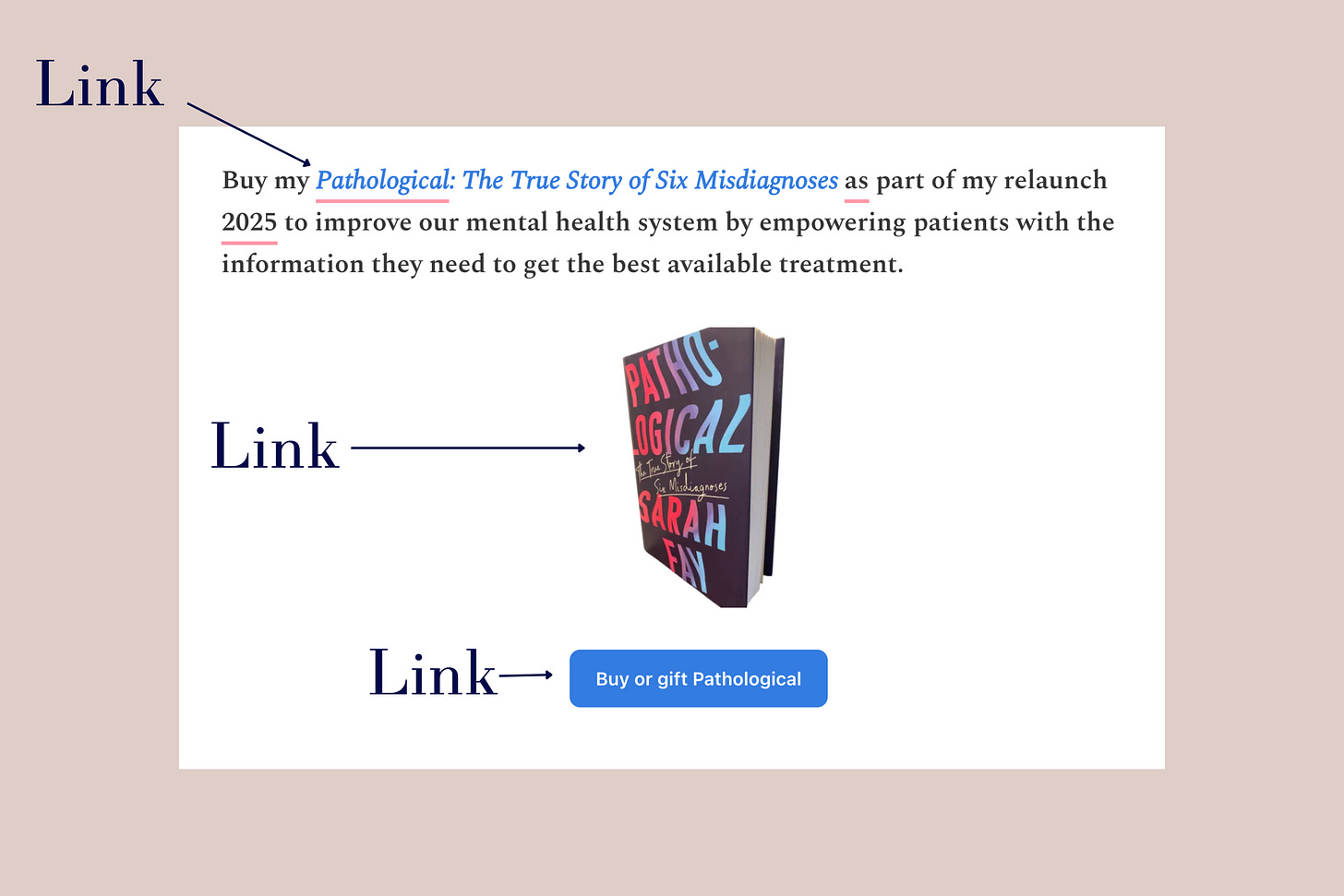 To hyperlink an image on Substack, click on the image once, go to the link icon in the menu bar, enter the URL.
