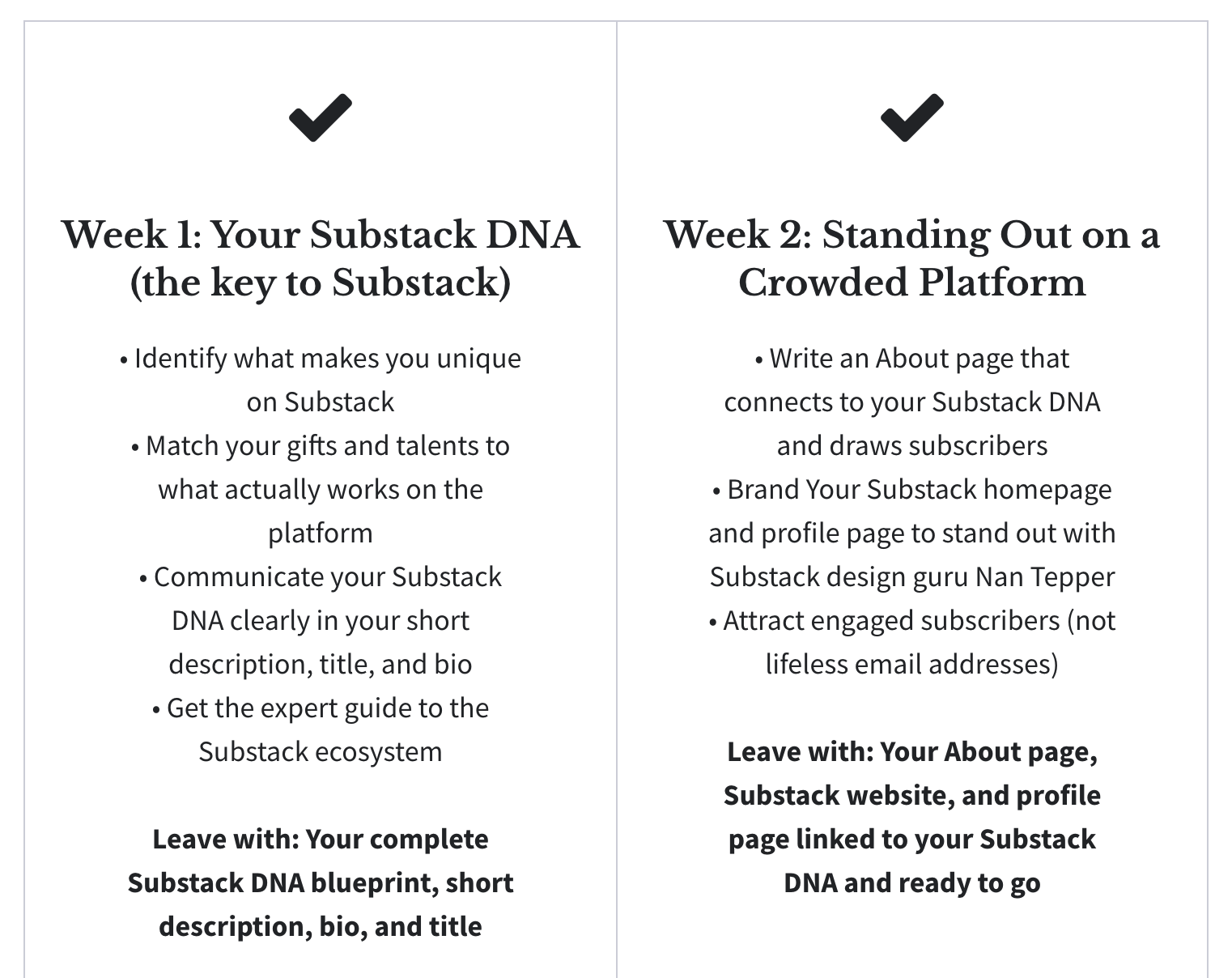 P.S. If you’ve taken the Substack DNA Intensive, this is next in the sequence. Respond to this email, and I’ll give you the discount code to enroll.