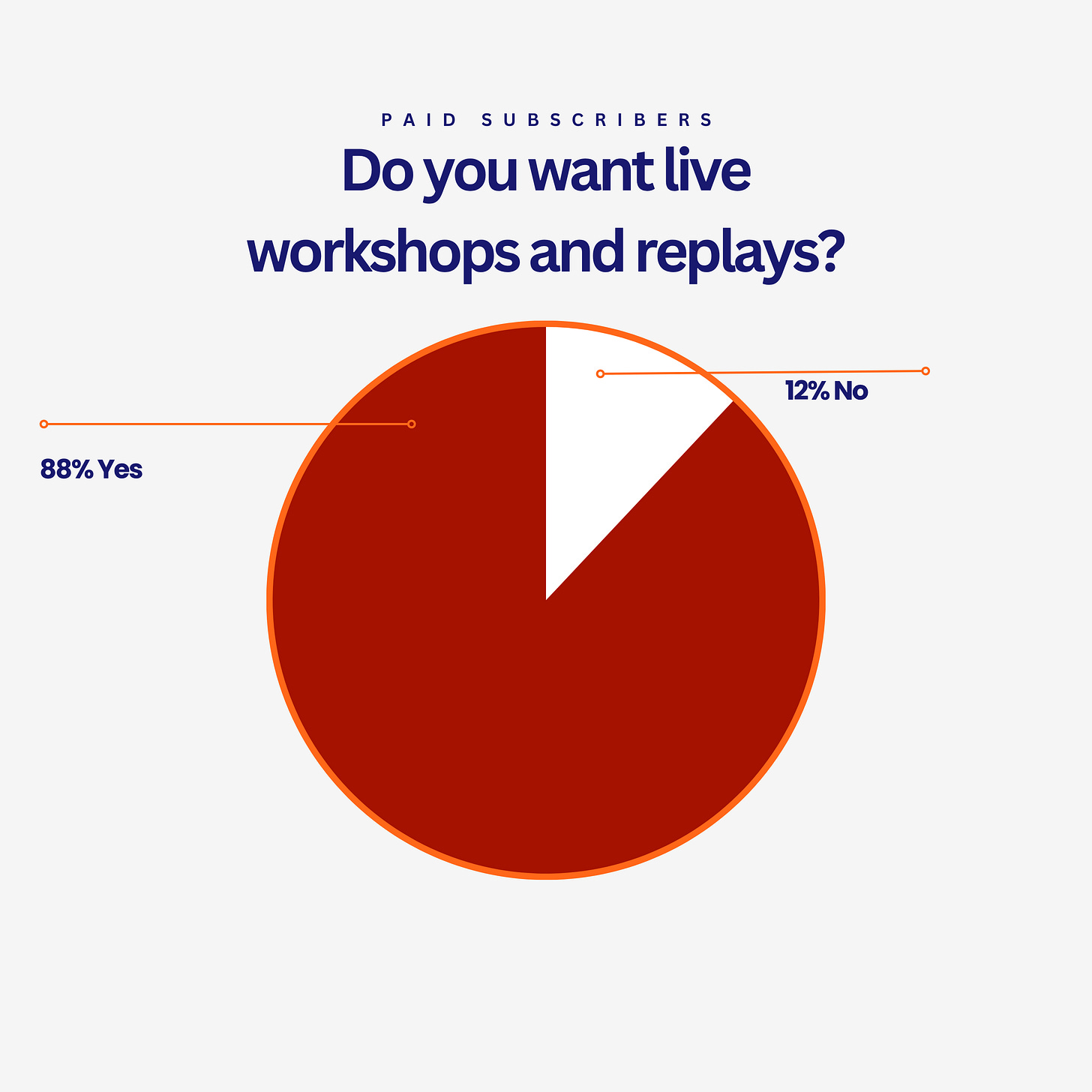 And nearly 90 percent of you want workshops. (Don’t worry, I’m hiring a video editor to create less-than-15-minute highlight replays.)